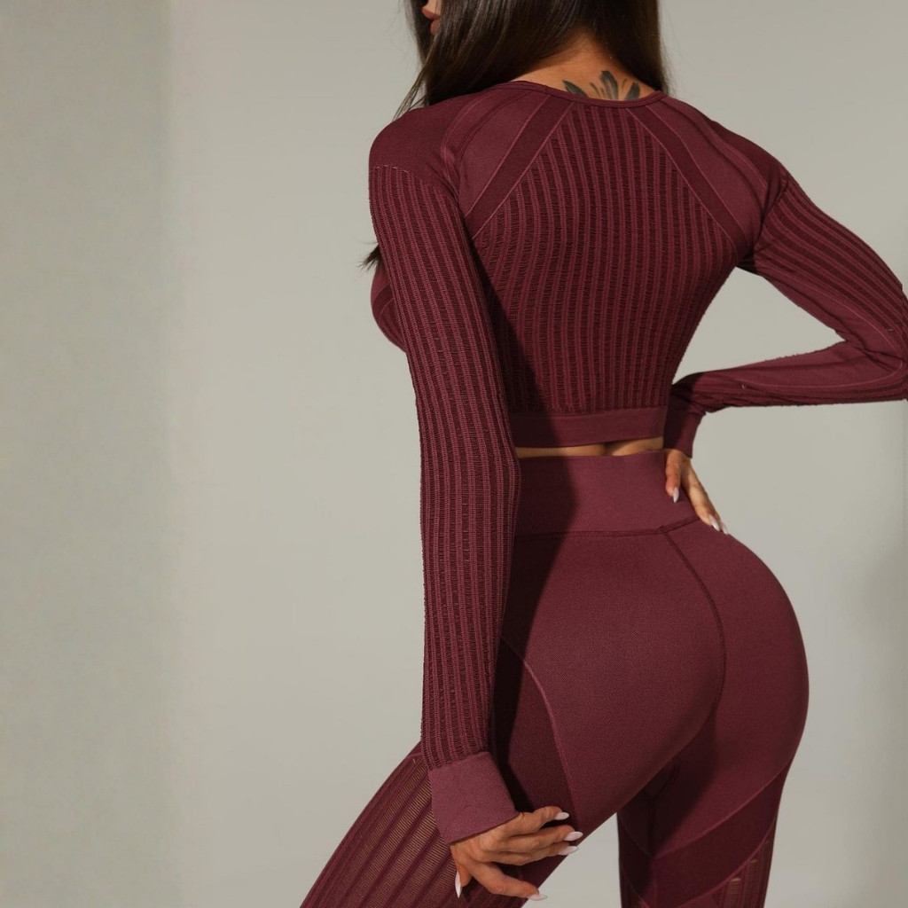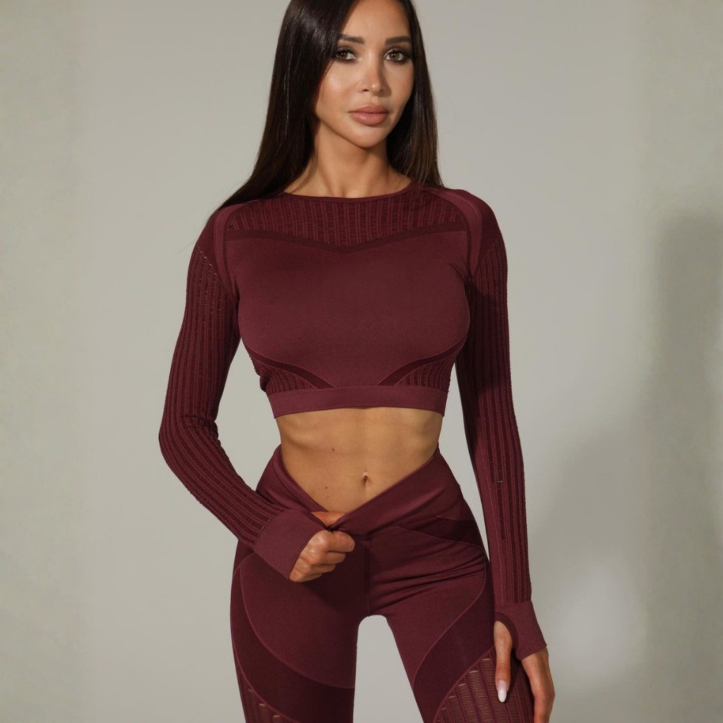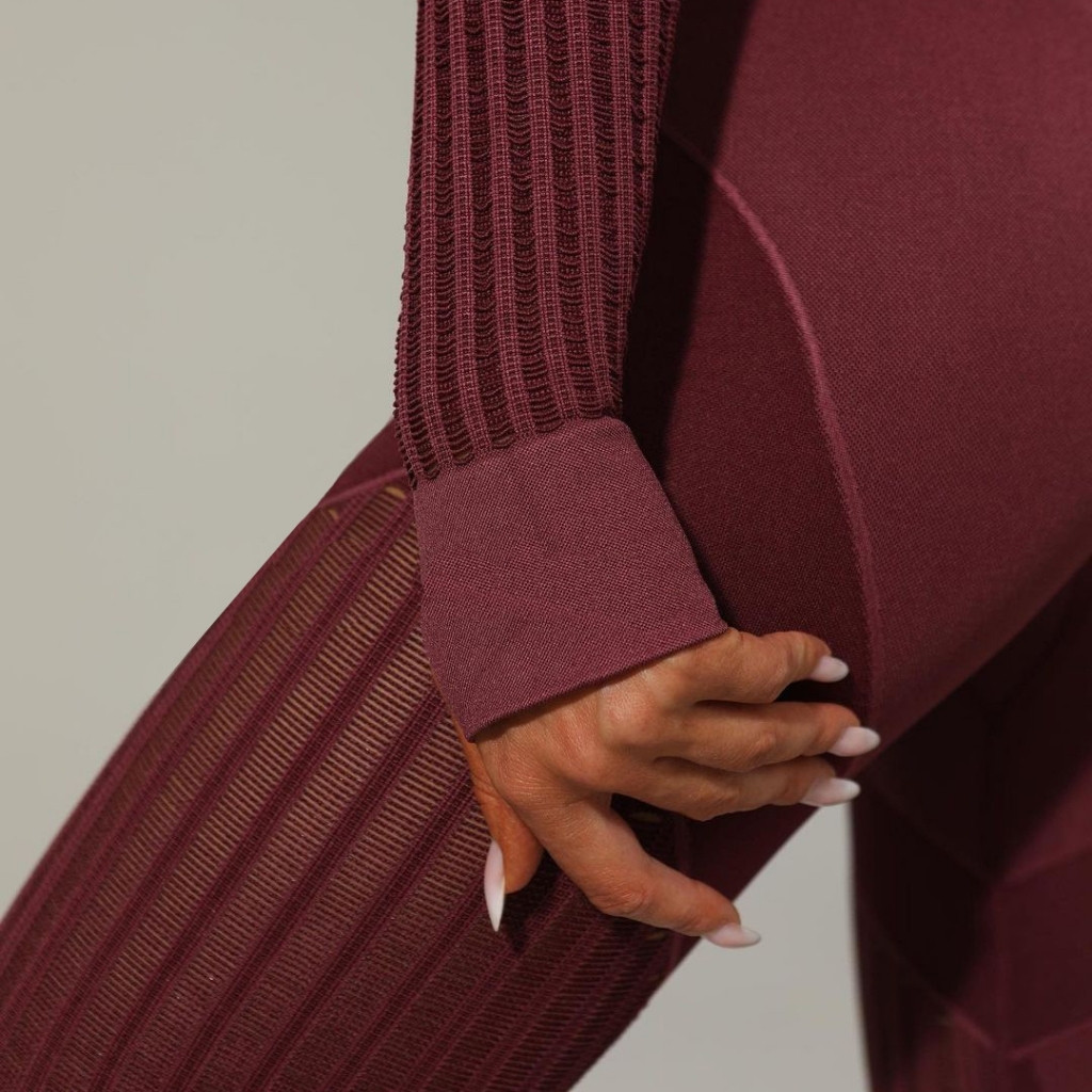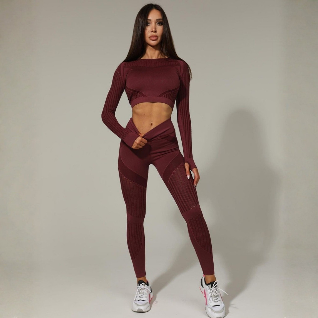 Divatos, szexy, 2 részes, hosszú ujjú, Sekond Skin, bordó színű, női edzőszett, amely nagyon előnyösen formálja az alakot. Izzítsd fel a tekinteteket és közben élvezd a maximális kényelmet. Rugalmas, bőrnek kellemes érzetű, légáteresztő, alakformáló, nagyon gyorsan száradó, matt, formatartó, kevert anyag. Megemeli, kiválóan hangsúlyozza a feneket, formálja a csípőt, visszahúzza, laposítja a hasat. Magasderekú nadrággal! Mosás: kímélő programon, kifordítva 30 fokon!