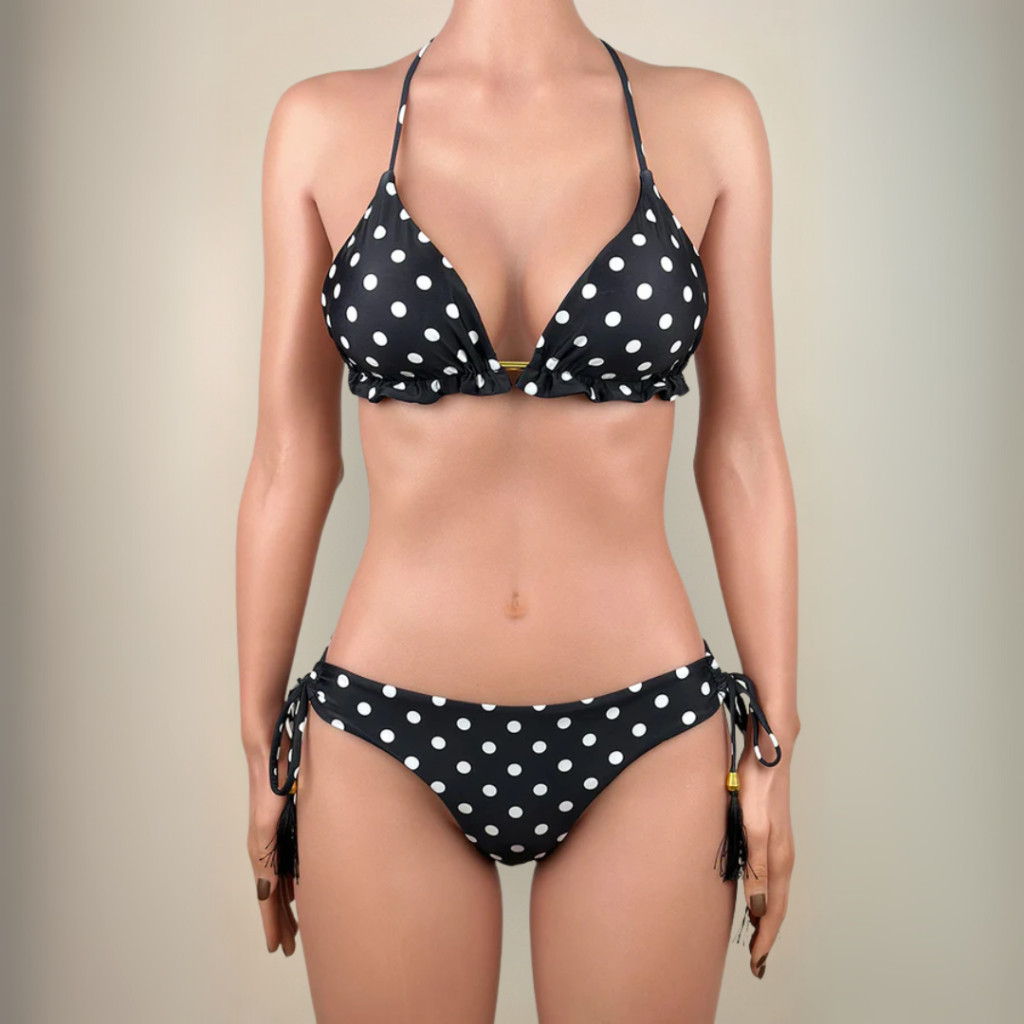 Vonzd oda a tekinteteket ezzel a nőies fekete fehér pöttyös brazil szabású kombinációval, amely az 1960-as évek Pin Up Girl stílusát idézi.